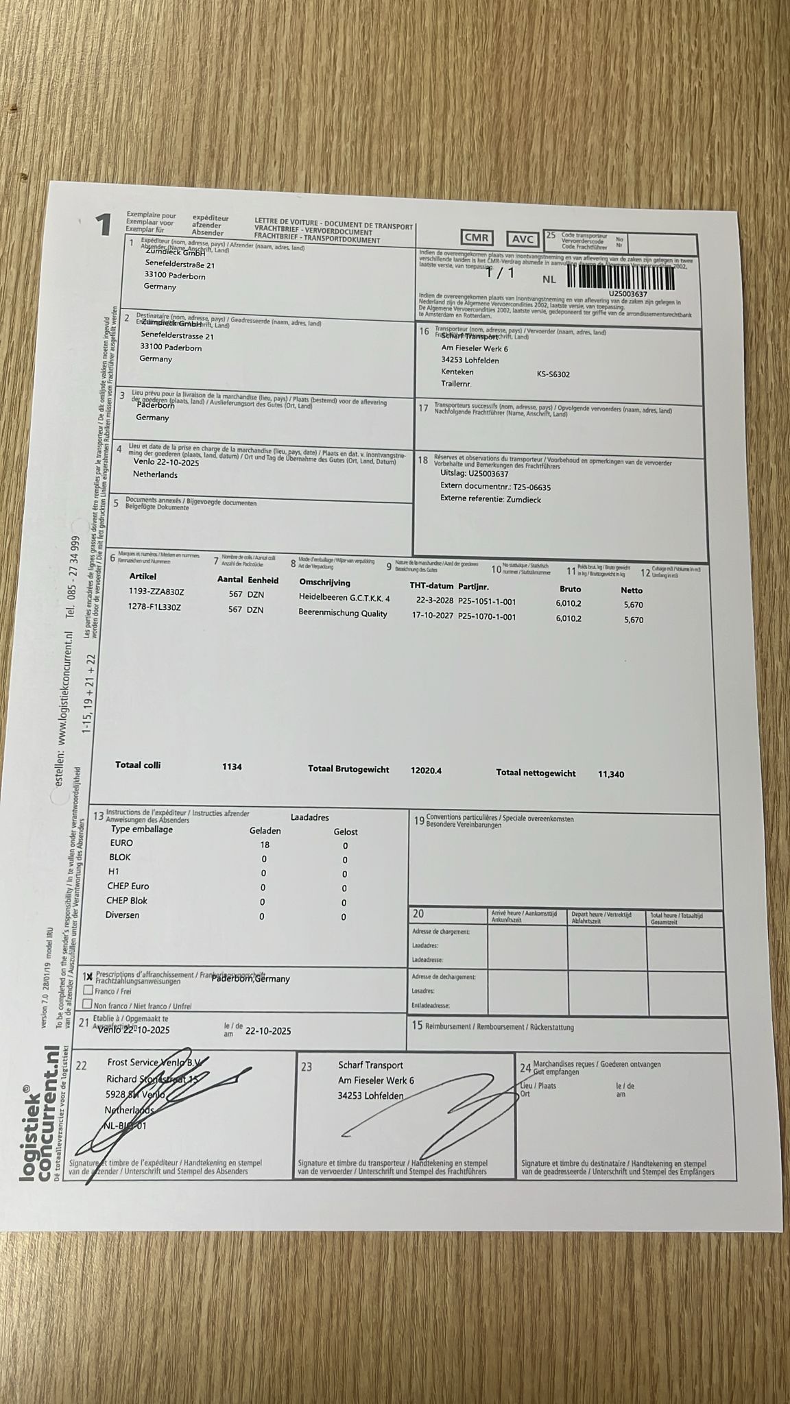 "value": "Extern documentnr.: T25-06635, Externe referentie: Zumdieck. Total colli: 1134. Loading units: EURO 18 pallets. Transport via Frost Service Venlo BV and Scharf Transport.",