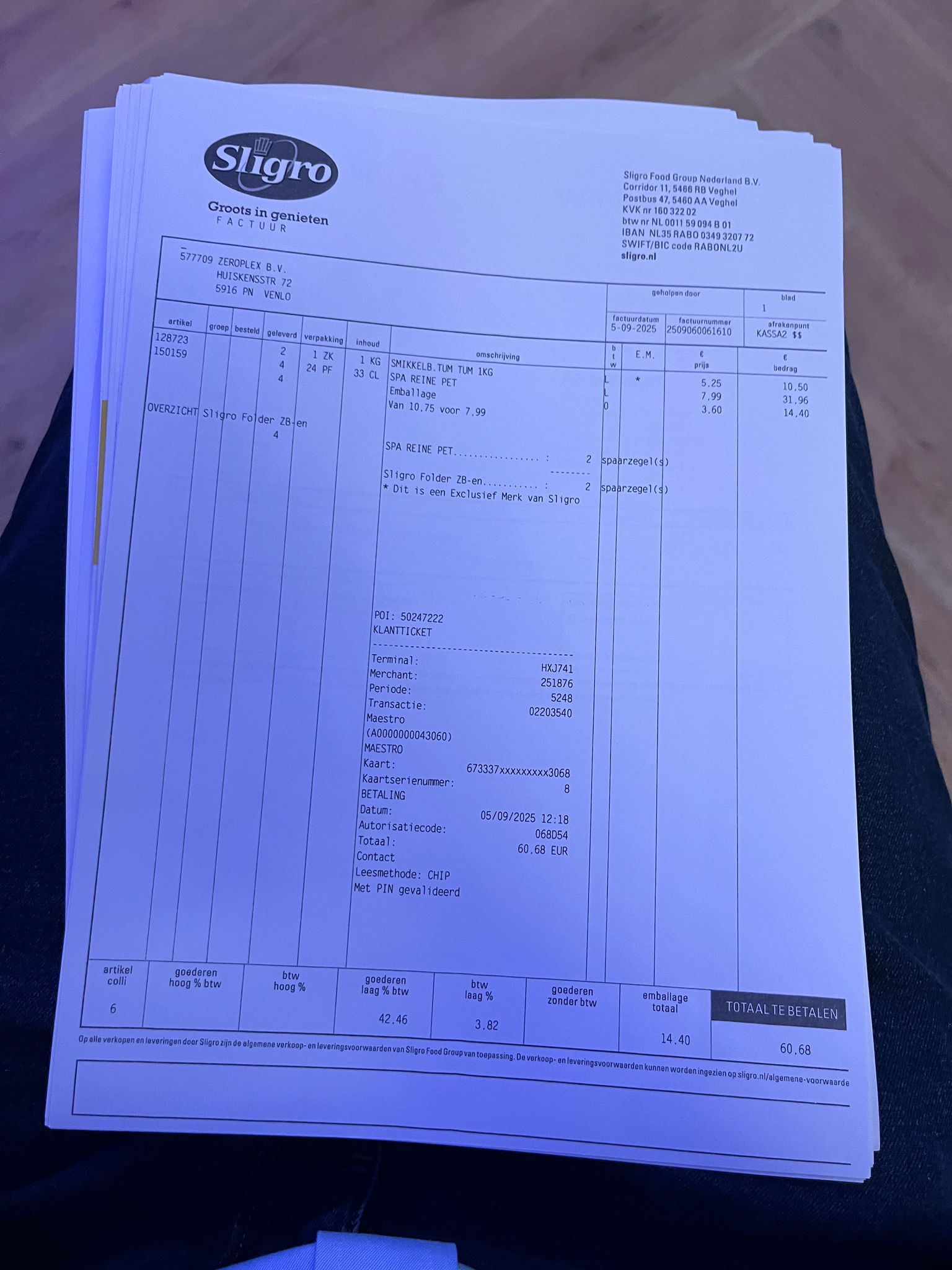 "value": "Purchase at Sligro store. Payment via Maestro card ending in 3068. Terminal H42741. Includes promotional folder items (28 cm). Dit is een Exclusief Merk van Sligro.",