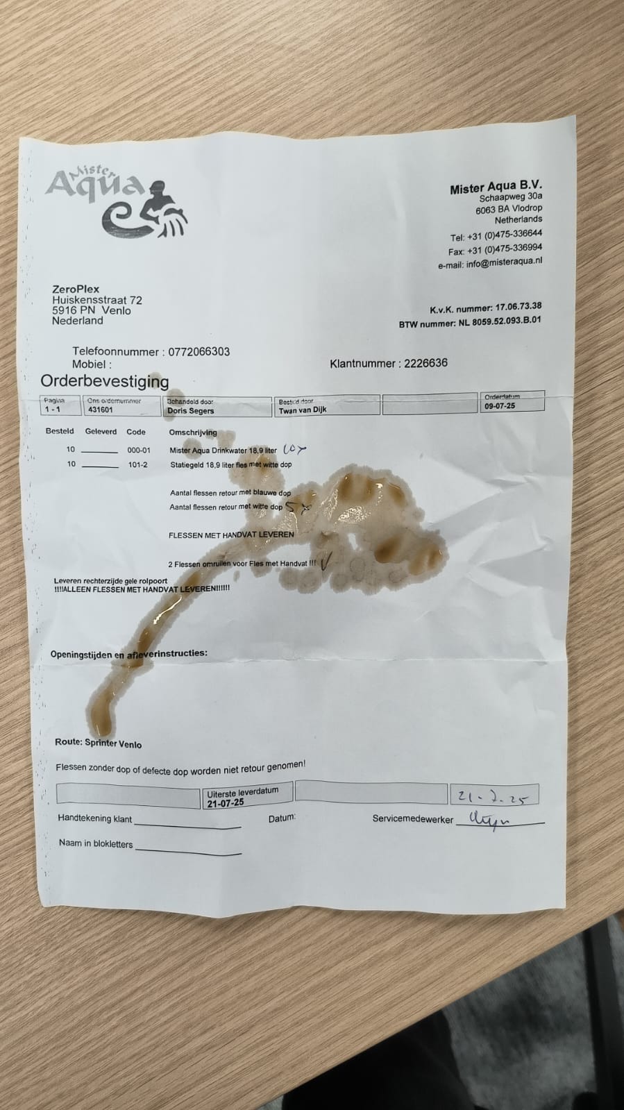 "value": "ALLEEN FLESSEN MET HANDVAT LEVEREN! 2 Flessen omruilen voor Fles met Handvat. Leveren rechterzijde pand rolpoort. Route: Sprinter Venlo. Flessen zonder dop of defecte dop worden niet retour genomen. Aantal flessen retour met blauwe dop en witte dop. Besteld door: Twan van Dijk. Door Doris Segers.",
