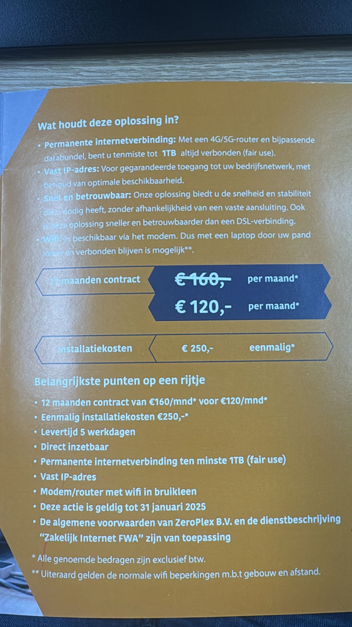 "value": "Promotional material for ZeroPlex B.V. internet service. Offer valid until 31 January 2025. Service includes: permanent 4G/5G internet connection with minimum 1TB fair use, fixed IP address, modem/router with wifi on loan. Pricing: €160/month or €120/month with 12-month contract, plus €250 one-time installation fee. Delivery time: 5 working days. All prices exclusive of VAT.",